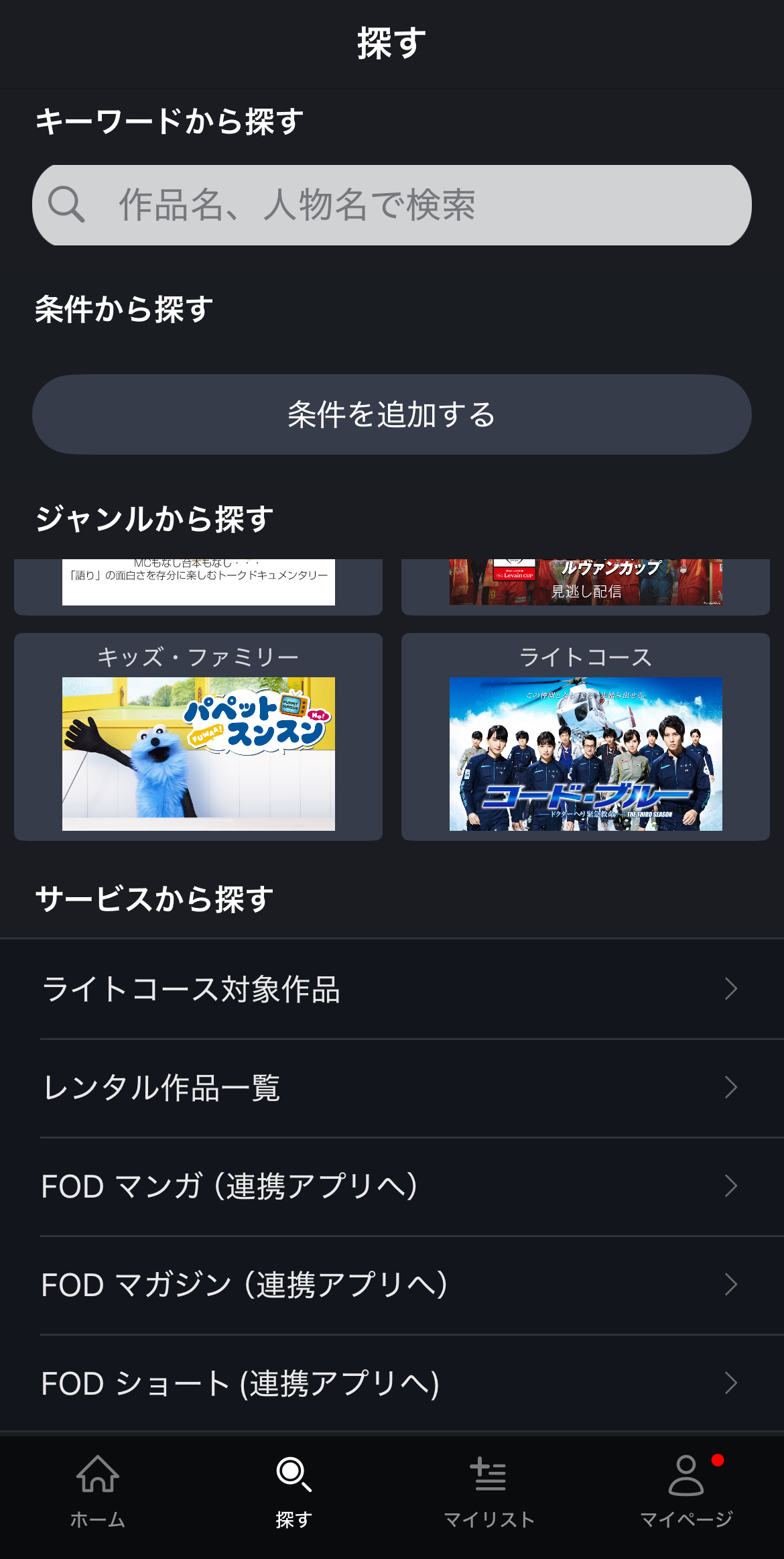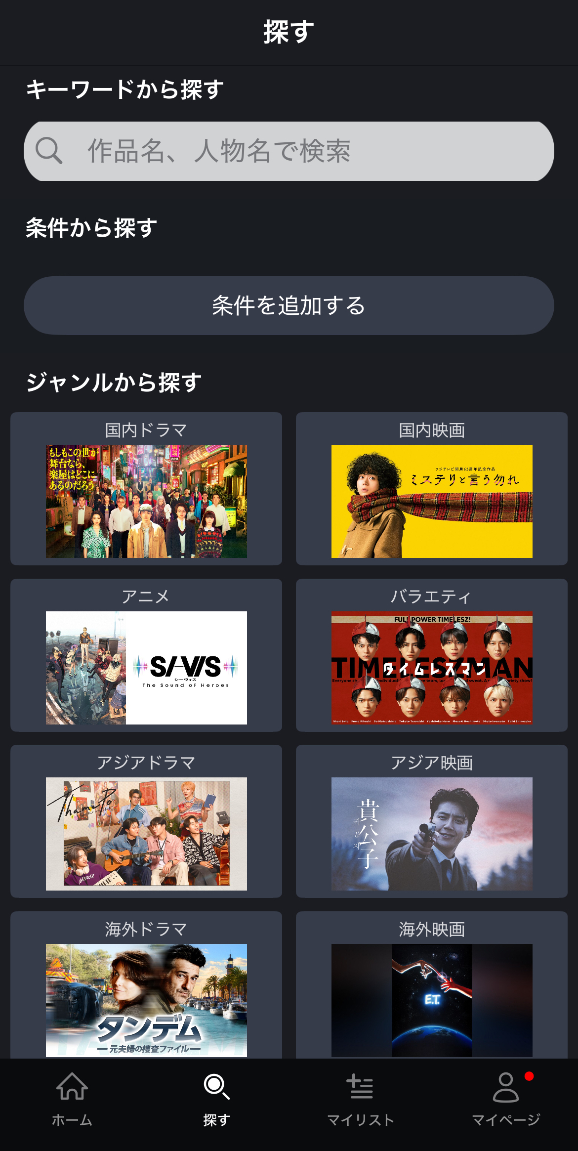 「探す」タブより作品名・出演者名・監督名やあらすじ等を入力して検索することができます。