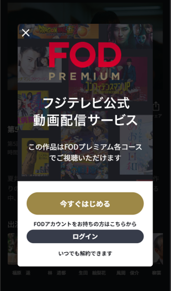 FODプレミアムをご契約中にFODプレミアム作品を視聴しようとしても以下画面が表示されて視聴できない場合は、以下の原因が挙げられます。