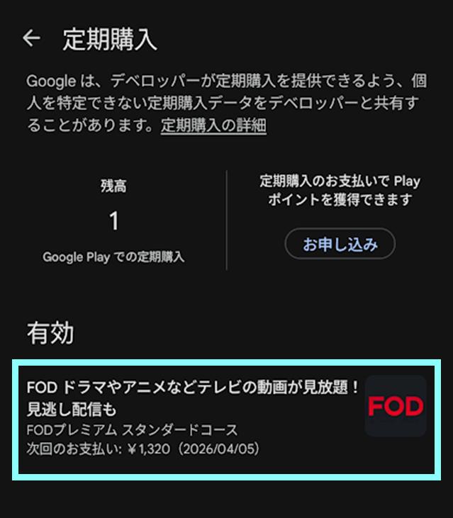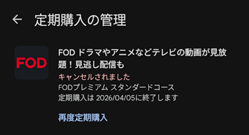 ※Google Play課金でFODプレミアムをご契約されている場合、同じFODアカウントで新たに他決済・他コースのご契約は行えません。