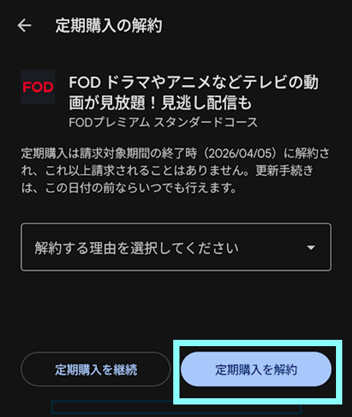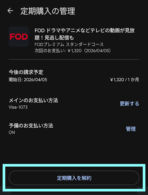Google Play課金から決済方法を変更する場合は、一度解約したのち、利用期限終了後にご希望の決済方法でFODプレミアムに再度ご登録ください。