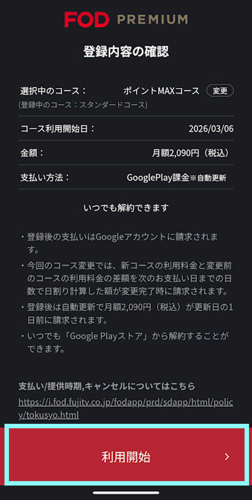 FODプレミアム(ライトコース/スタンダードコース/ポイントMAXコース)にGoogle Play課金でご登録されている方は、以下をご確認の上、決済変更/コース変更手続きを行ってください。