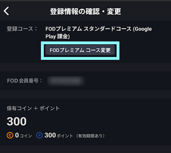 2.現在登録しているコース名が表示されます。「FODプレミアム コース変更」を押します。