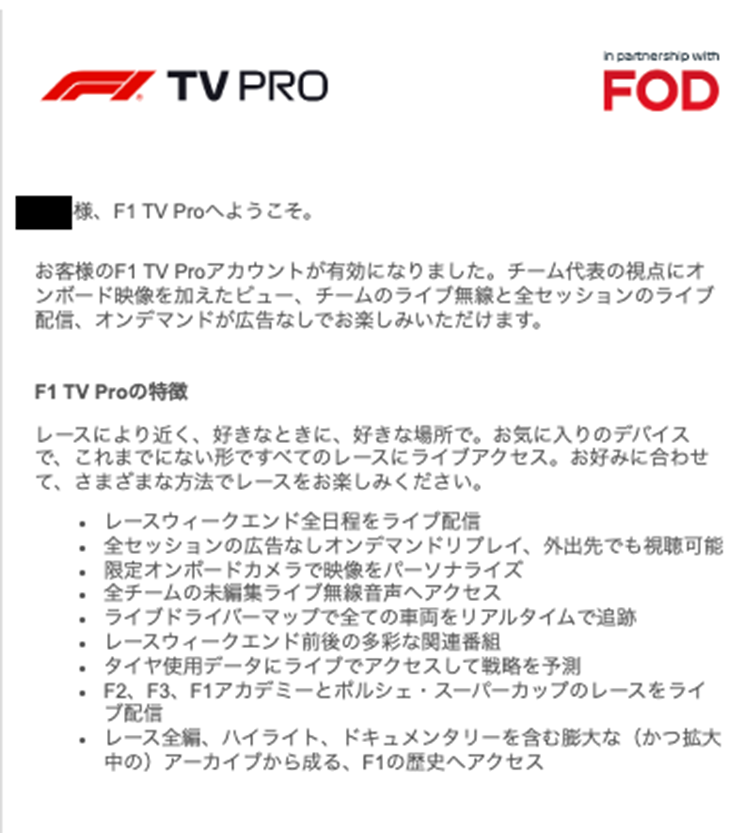「F1® TV」とのID連携が完了すると、「F1® TV」から完了メールが届きます。