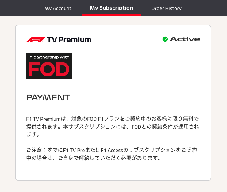 - 「F1® TV」Accessコースに契約済みではないか / FOD F1™ プランを介さず「F1® TV」Proコースに契約済みではないか