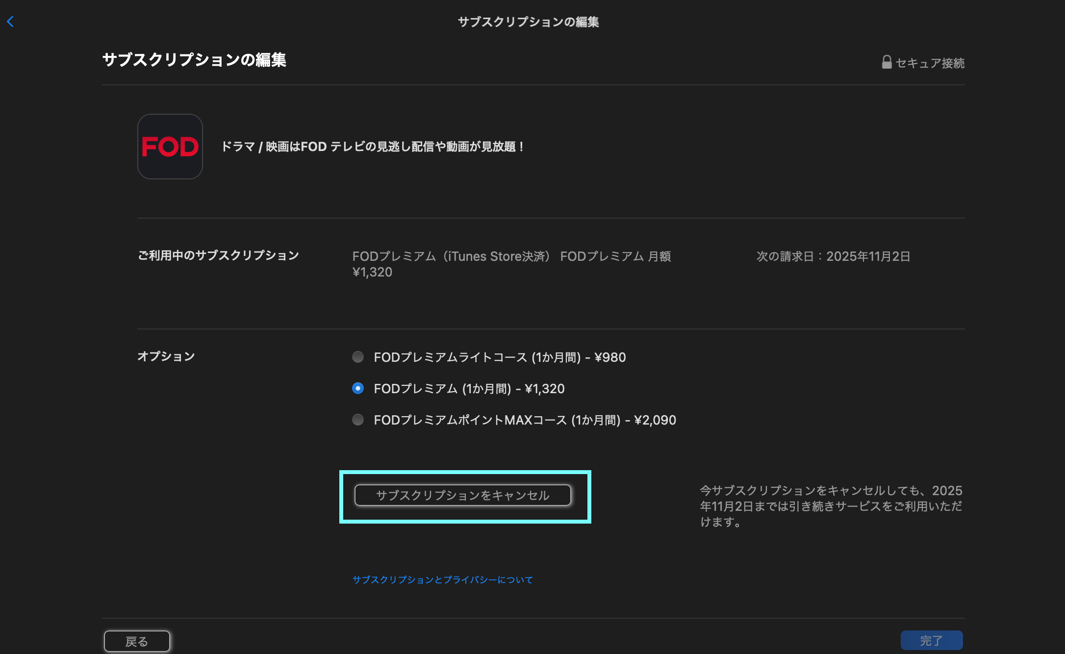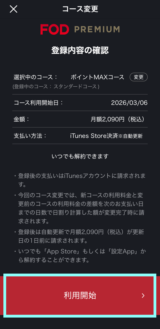 iTunes Store決済から決済方法を変更する場合は、一度解約したのち、利用期限終了後にご希望の決済方法でFODプレミアムに再度ご登録ください。