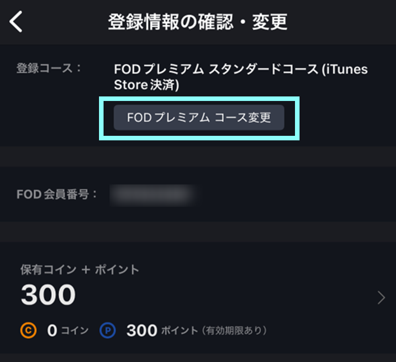 2.現在登録しているコース名が表示されます。「FODプレミアム コース変更」を押します。