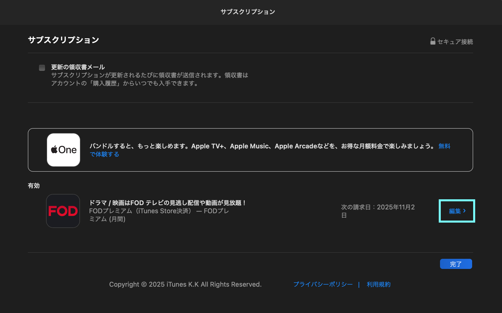 4.サブスクリプションの画面で現在登録されているコンテンツが表示されるため、コンテンツよりFODを選択し、「編集」を押します。