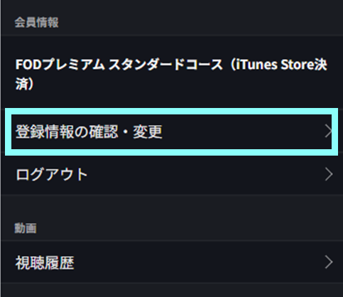 1.iOS端末のFODアプリにて、「マイページ」より、「登録情報の確認・変更」を押します。