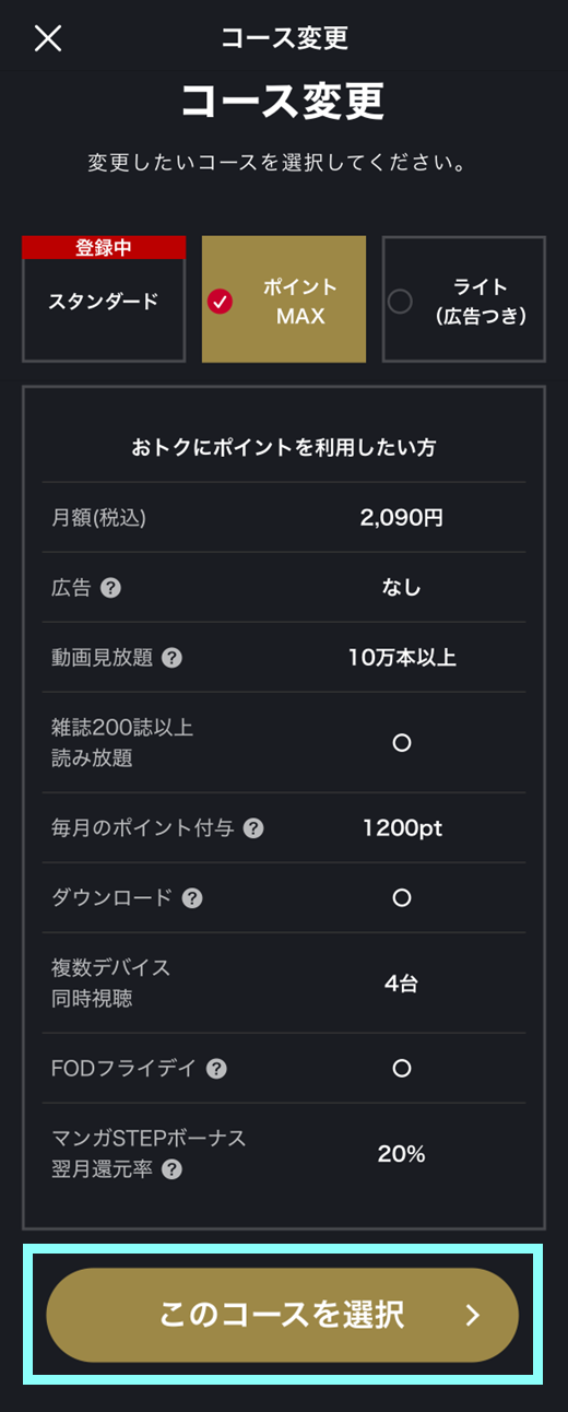 ※「ほかのコースを見る」を押すと、FODプレミアム ポイントMAX付帯コースが表示されます。
