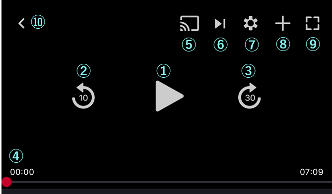 ②30秒もどる 30秒前に戻って再生されます。※⑧の設定から秒数を変更できます