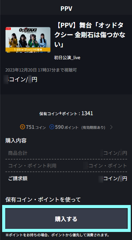 7.PPV対象コンテンツのページの「購入する」を押し、不足分をカード決済します。