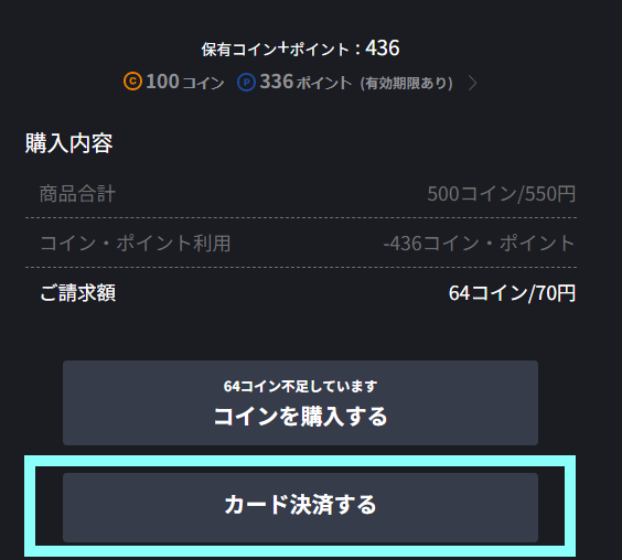 ※コインとポイント・商品券をお持ちの場合は、商品券から消費され、次にポイントが自動的に消費されます。
